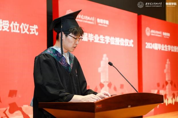 授位仪式在庄严的国歌中正式拉开帷幕。学位评定委员会主席郭立新教授宣读授位决定并致辞,他嘱咐毕业生要秉持科学探索的精神,深入洞察世界的奥秘;要怀抱精进钻研的初心,踏实奋进,追求卓越;要胸怀远大理想,施展理工交融的才华,勇攀科技高峰;更要将所学用于国家发展,争做新时代的强国先锋。