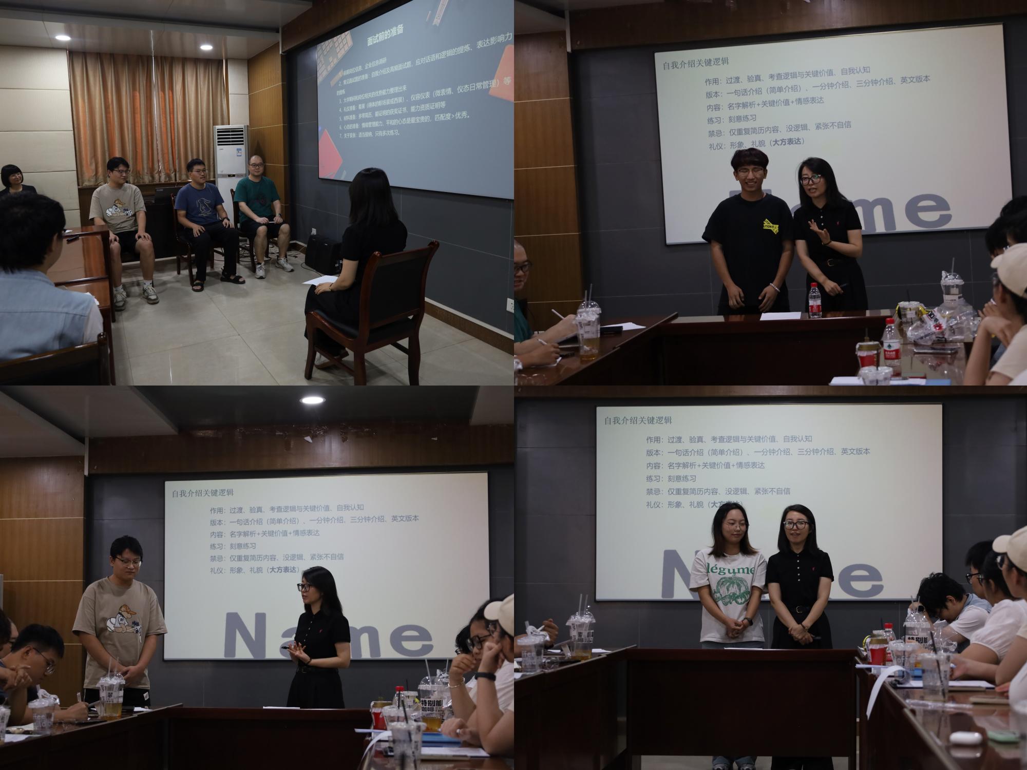为了让同学们深刻体验面试场景,韩老师邀请三位学生上台模仿面试官,针对面试中遇到的问题进行了情景演绎,帮助同学们更好的体验面试过程中遇到的各种情况。在讲解面试中自我介绍的部分时,又对上台的几位同学给予了针对性的建议和意见,使得活动的教育性得到了很大的提升。
