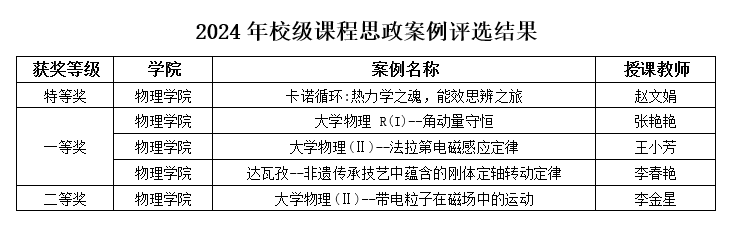 (通讯员:柴亚茹)近日,学校发布了《yl6809永利集团关于2024年优秀课程思政教学案例评选结果通知》(本字〔2024〕114号),公布了2024年度校级优秀课程思政教学案例评选结果。经个人申报、学院推荐、学校评审,全校共评选出特等奖9项、一等奖14项、二等奖23项。其中,我院赵文娟老师的《卡诺循环:热力学之魂,能效思辨之旅》荣获特等奖,张艳艳老师的《大学物理 R(I)--角动量守恒》、王小芳老师的《大学物理(Ⅱ)--法拉第电磁感应定律》、李春艳老师的《达瓦孜--非遗传承技艺中蕴含的刚体定轴转动定律》荣获一等奖,李金星老师的《大学物理(Ⅱ)--带电粒子在磁场中的运动》荣获二等奖,充分展示了学院在推进课程思政建设方面取得的积极成果和显著成效。