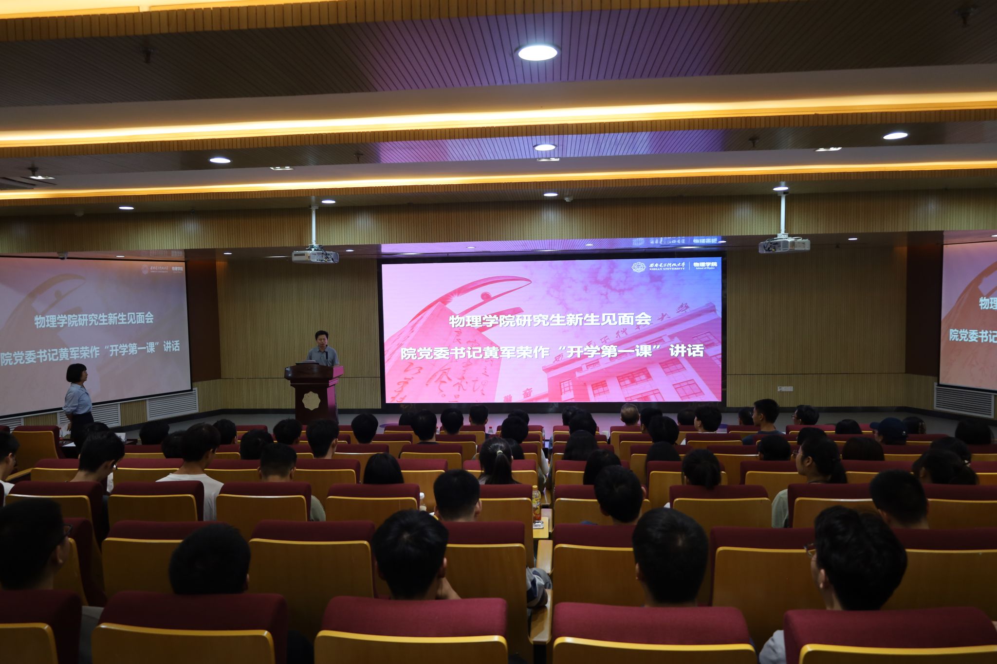 黄军荣代表学院欢迎2024级研究生加入yl6809永利YL集团的大家庭,随后他以“传承红色基因 共建科技强国”为题为2024级新生上了开学第一课,他寄语新生要传承西电的红色基因、厚植家国情怀、严谨科研态度、扎实工作作风,做新时代的物理学人,争当科学高峰的攀登者、科学家精神的传承者和优良学风的践行者,将自我价值的实现与国强富强民族振兴结合起来,成为生逢其时、勇挑重担的有为青年!