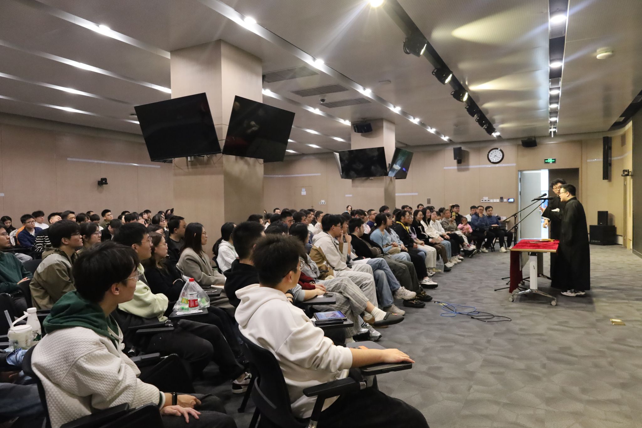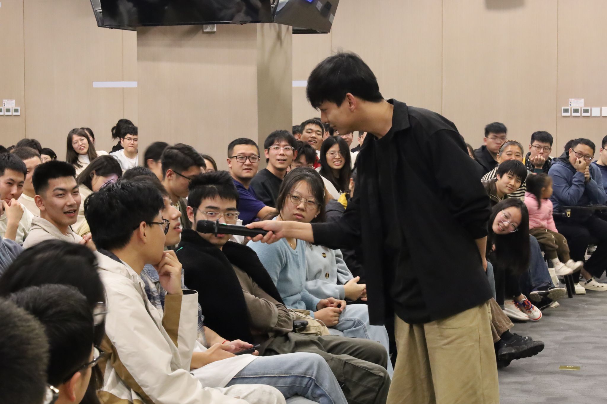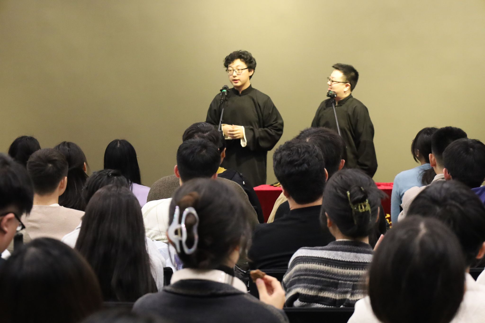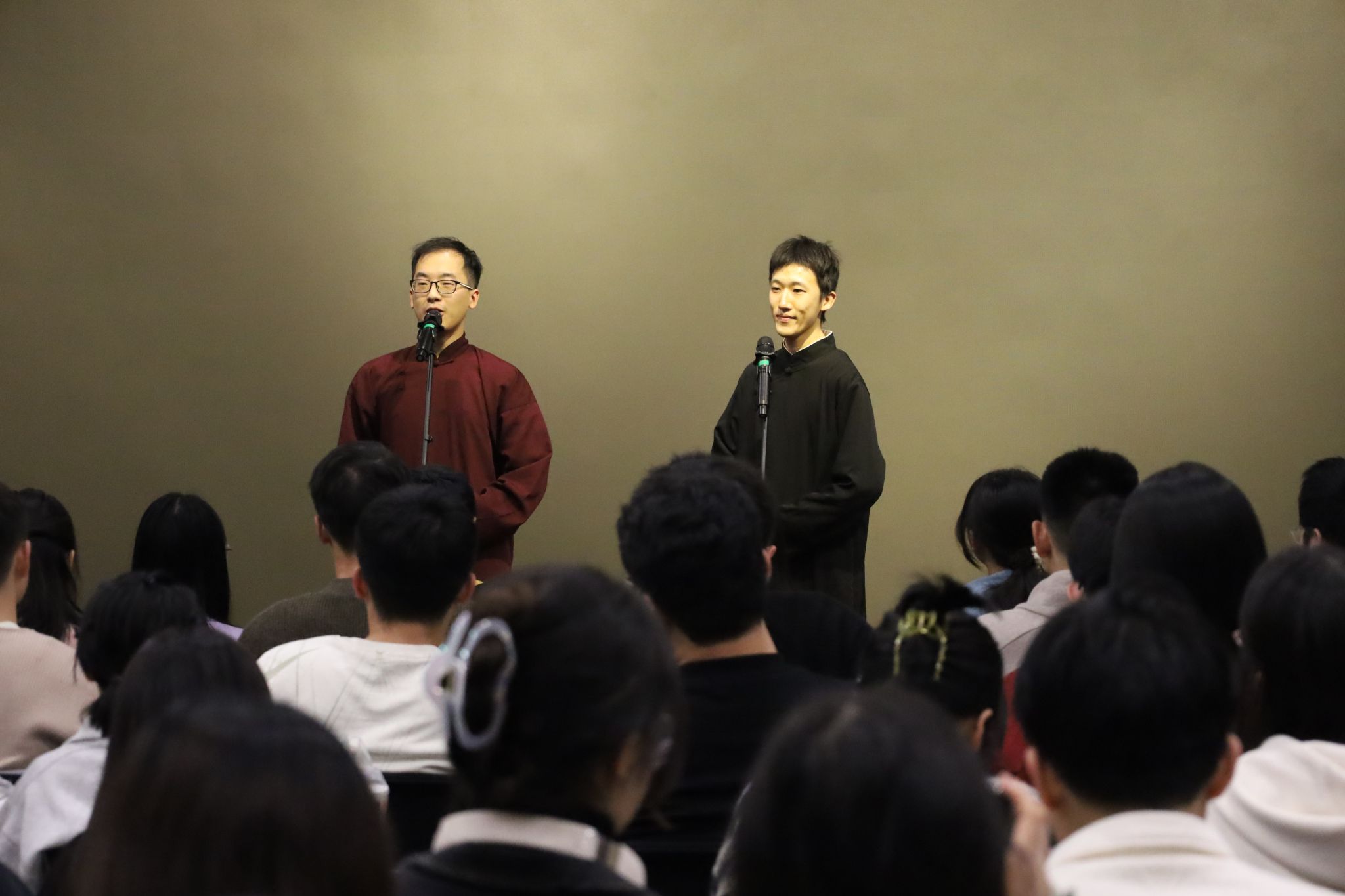 (通讯员 于天玮)把烦恼团成线团,用欢乐重新编织,如约而至的笑声驱散了不期而遇的秋思。10月26日,yl6809永利YL集团于北校区会议中心104成功举办“物忧物虑”喜剧专场演出。学院特邀yl6809永利集团介四相声社、西安交通大学博雅曲艺社、西安马上喜剧,为北校区师生带来了一个难忘的欢乐夜晚。演出现场起满座满、掌声笑声不断,共吸引250余名研究生师生前来观看。