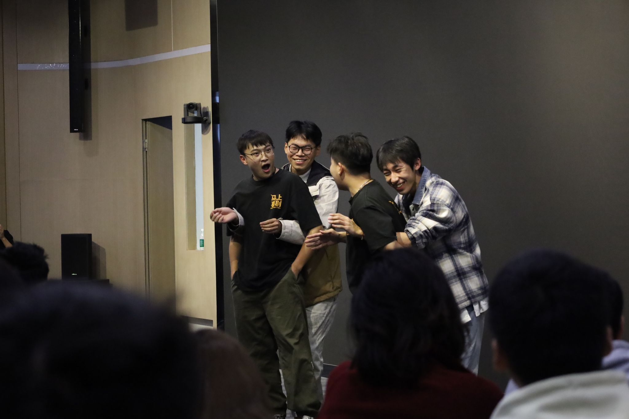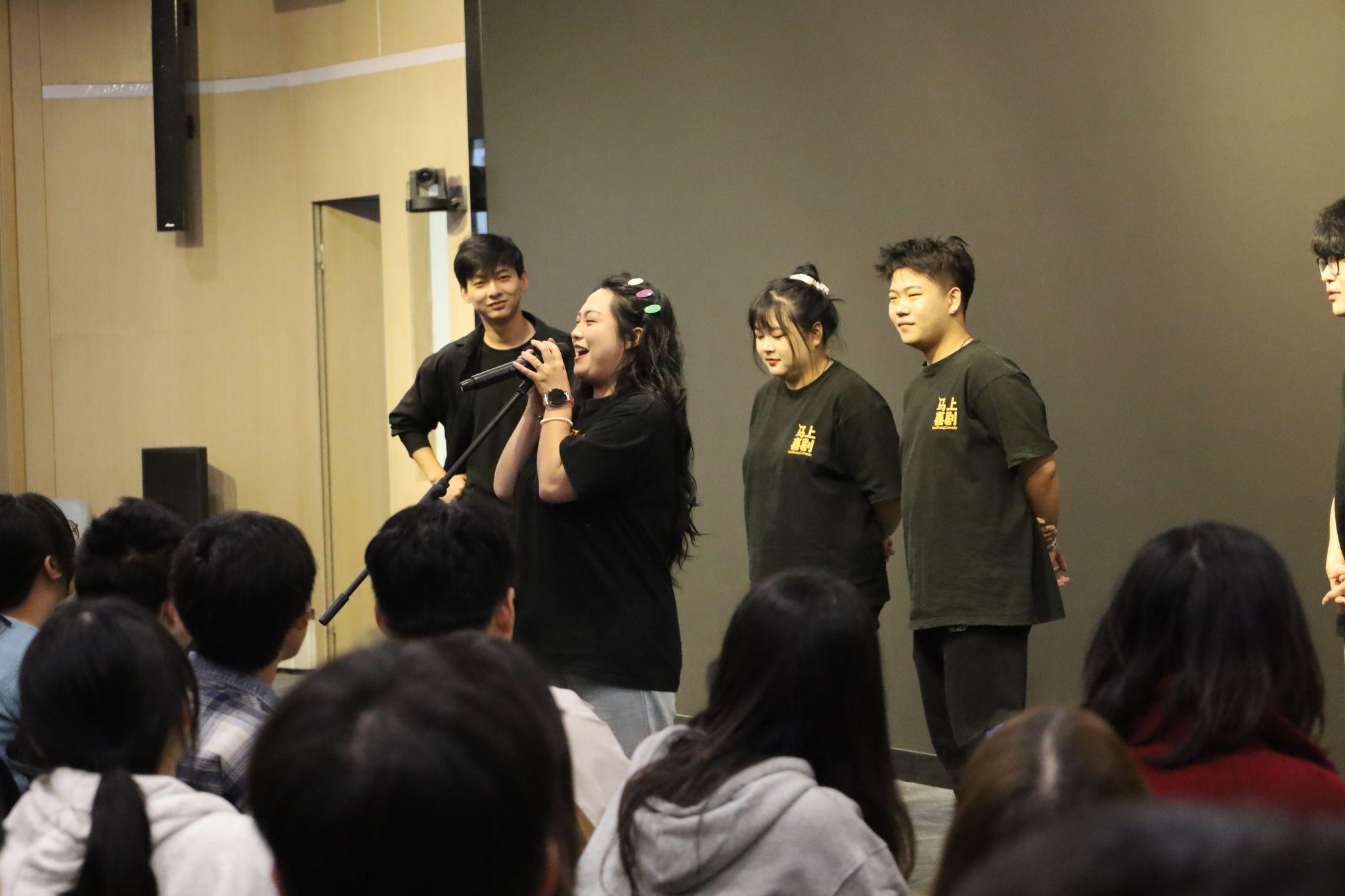 相声节目后,西安马上喜剧的6名青年演员带来了《叮叮重演》《飞鸽传书》等5个即兴喜剧节目。“即兴喜剧”是一种没有剧本的喜剧表演形式,演员引导观众“创造”命题,根据现场观众的建议和突发的灵感,在舞台上即兴创作出喜剧。同学们开动脑筋,“亲自”参与喜剧表演,为演员“想办法”、“出难题”。思维跳跃着、灵感碰撞着,无数的灵光一闪交织成一张欢乐的“神经网络”,将奇思妙想发散到想象力的无限时空。演员们在极快的临场反应中融入多种喜剧表演技巧,用轻松明快的表演节奏、意想不到的灵感火花,为观众带来“情理之中、意料之外”的喜剧体验。
