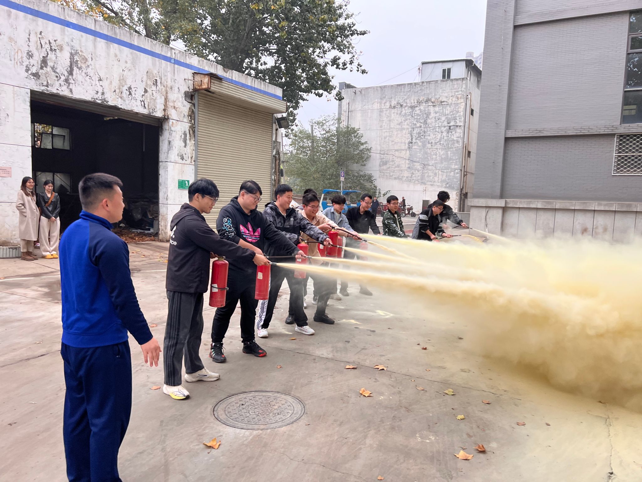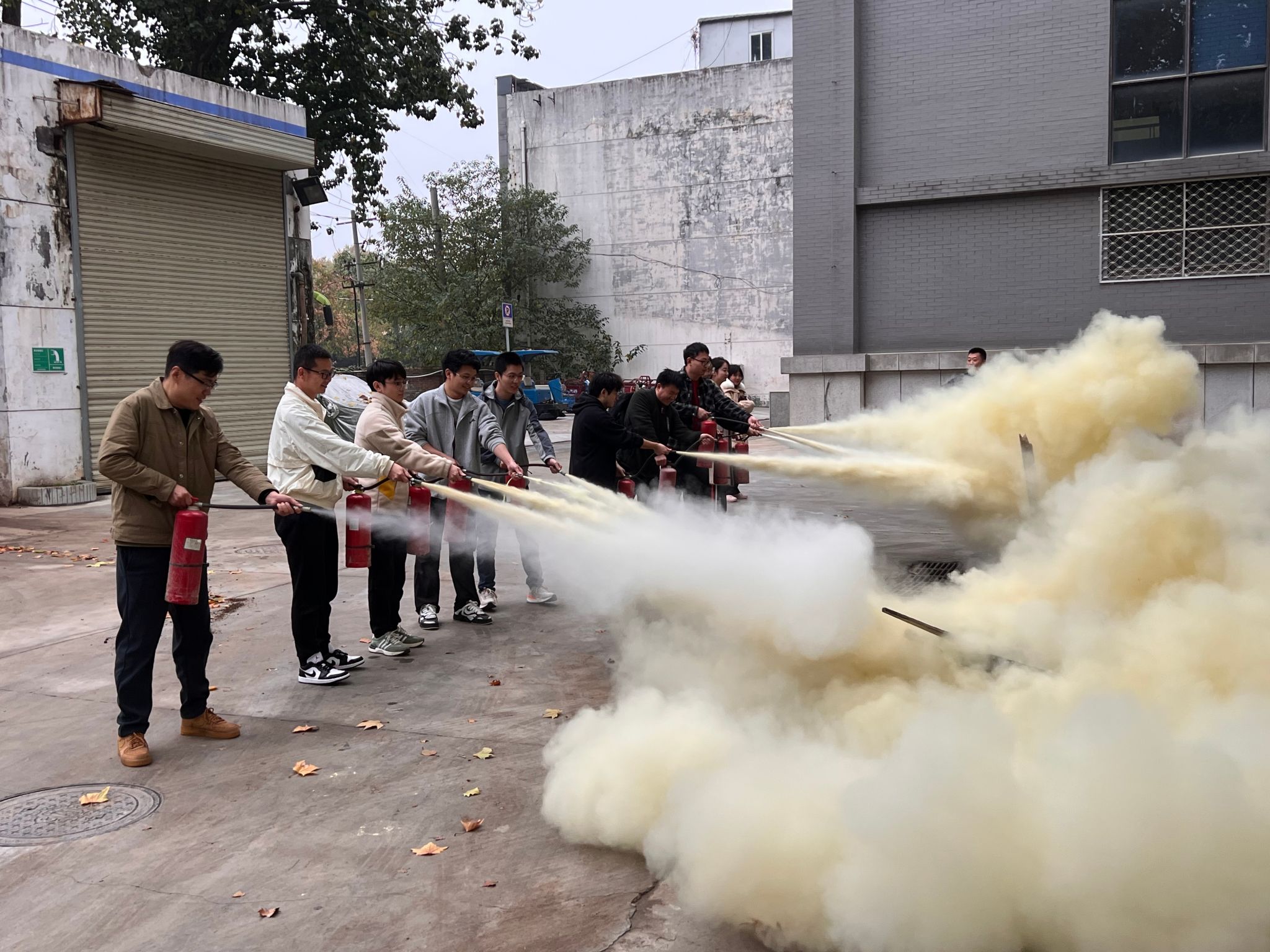 师生们在认真观摩演示后,分组有序地进行了实操练习。大家纷纷拿起灭火器,按照所学步骤,紧张而又认真地进行灭火操作。