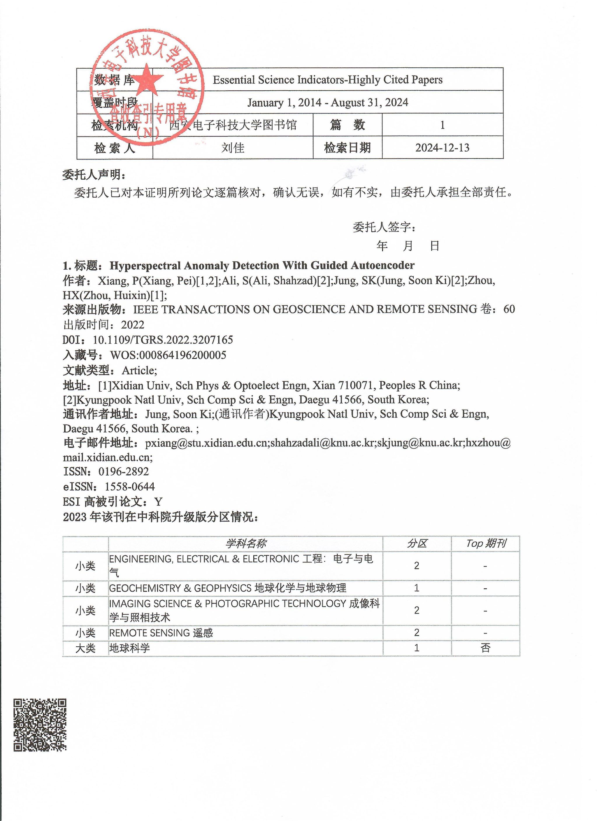 (通讯员:向培)据2024年12月Essential Science Indicators(简称ESI)统计数据显示,yl6809永利YL集团周慧鑫教授团队成员向培以第一作者身份于2022年9月在《IEEE Transactions on Geoscience and Remote Sensing》(中科院一区、IF:7.5)上发表的研究成果“Hyperspectral anomaly detection with guided autoencoder”被ESI数据库遴选为高被引论文。