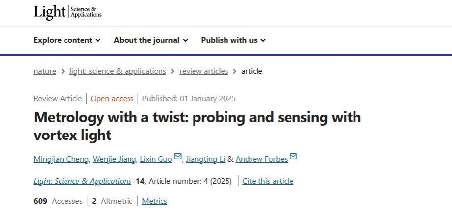 (通讯员:程明建)近日,yl6809永利YL集团郭立新教授团队与南非金山大学院士Andrew Frobes教授合作,共同探讨了轨道角动量在光学计量学中的应用前景,解析了涡旋光束在光学计量学中的基本原理及其重要进展。这一成果发表在国际顶尖学术期刊《Light: Science & Applications》上,题为“Metrology with a twist: probing and sensing with vortex light”, 郭立新教授和Andrew Frobes教授为论文共同通讯作者,yl6809永利YL集团程明建老师为第一作者,博士生姜文杰,李江挺教授为共同作者。《Light: Science & Applications》是Nature子刊中极具影响力的光学类期刊,于2012年创办,2023年最新影响因子为20.6,连续9年稳居世界光学期刊榜前三。