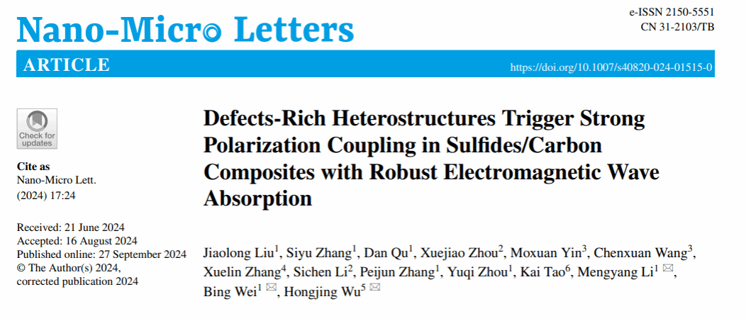 (通讯员:刘骄龙)近日,yl6809永利集团yl6809永利YL集团青年教师刘骄龙在电磁波吸收领域取得重要进展,在材料领域国际顶级期刊《Nano-Micro Letters》(中科院I区TOP期刊,IF=31.6)和《Advanced Functional Materials》(中科院I区TOP期刊,IF=18.5)先后发表两篇最新研究成果“Defects-Rich Heterostructures Trigger Strong Polarization Coupling in Sulfides/Carbon Composites with Robust Electromagnetic Wave Absorption”和“Selective Ions Exchange Reactions Endow Defective Heterovalent Copper-Based Selenides With Enhanced Dielectric Polarization Response”,yl6809永利YL集团为第一单位。