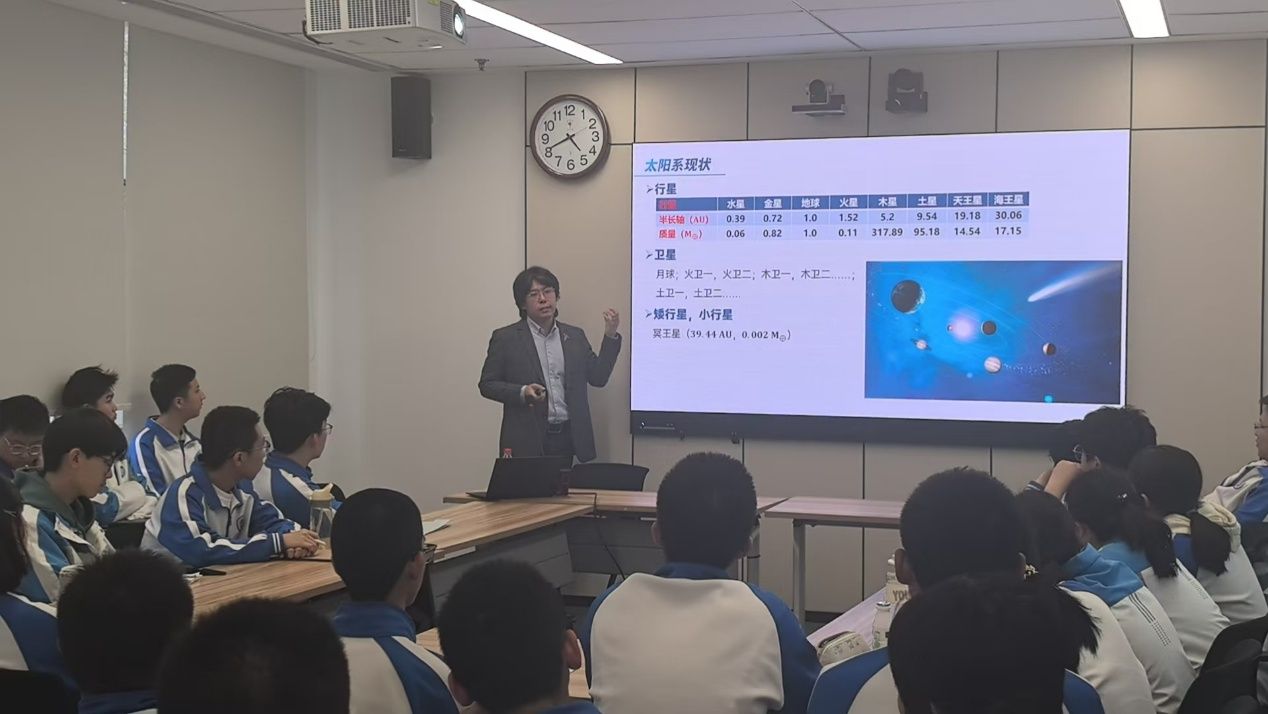 参观结束后,王欣明老师为全体师生作了《宇宙生命的起源与演化》专题报告。通过生动的宇宙演化模型演示,王教授带领同学们穿越时空长河,从太阳系的缘起讲到宇宙的边缘,从恒星的诞生讲到黑洞形成。同学们被精彩的报告深深吸引,纷纷提出自己的问题与见解,现场气氛热烈。
