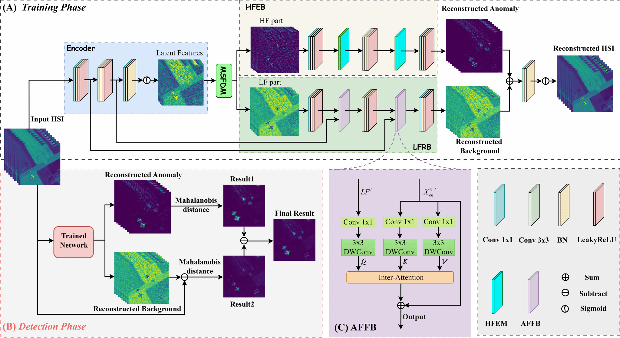 第一篇论文针对高光谱图像中异常目标与背景具有不同属性的问题,设计了基于频率分解引导双路网络(MFTNet)的高光谱异常检测算法。该方法核心创新点如下。