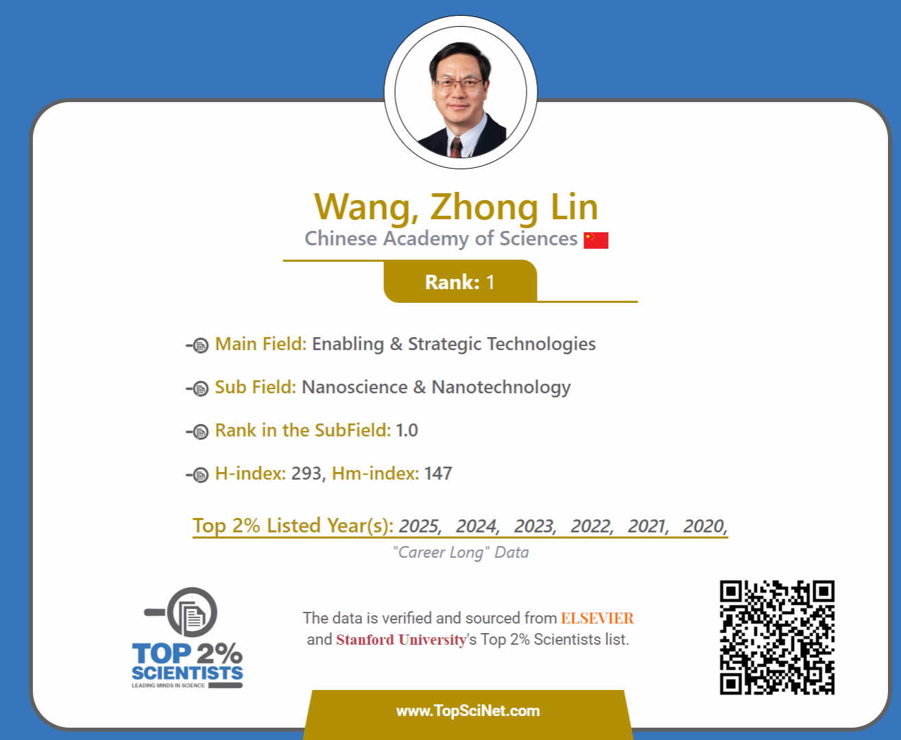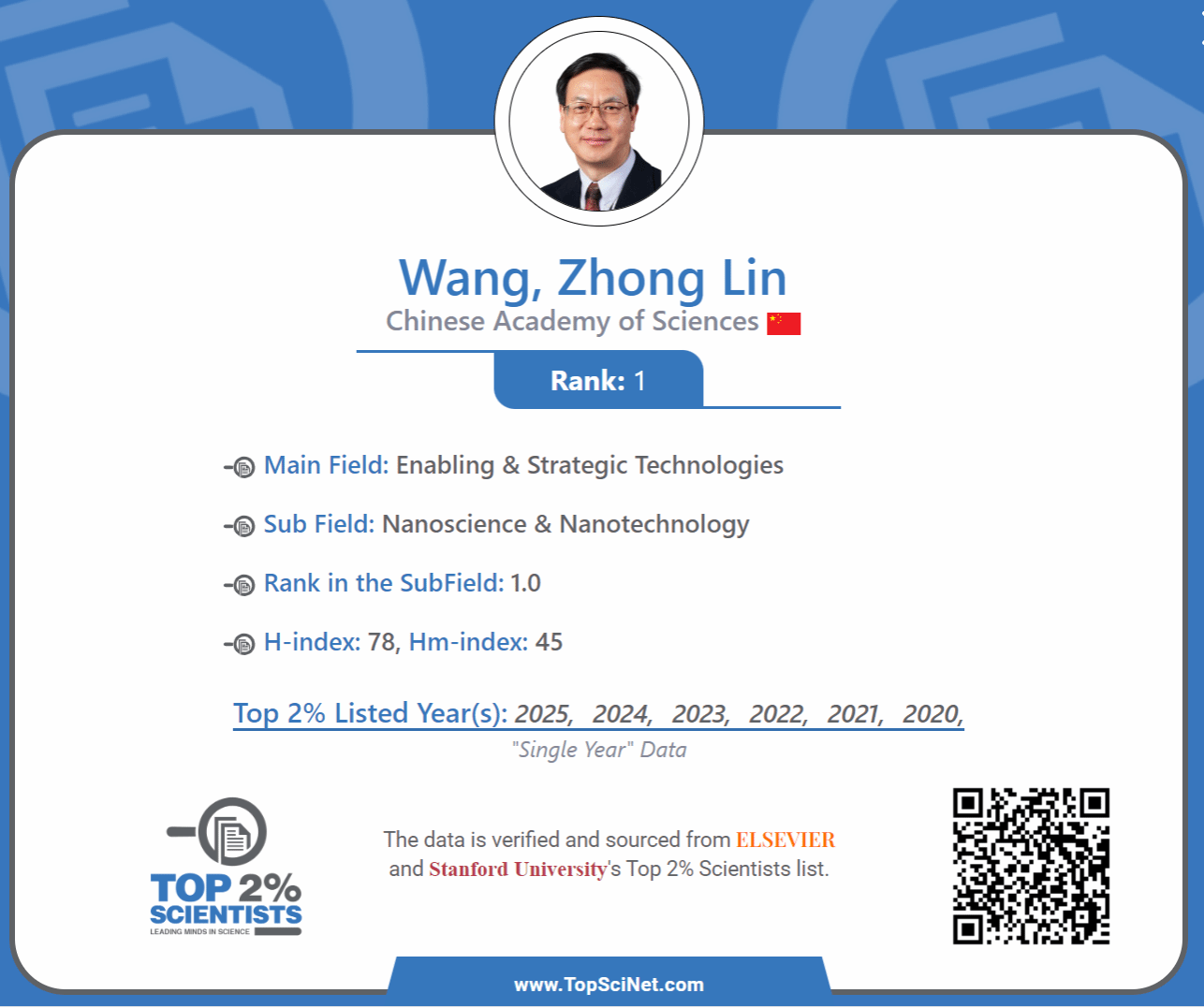 王中林 | 终身科学影响力排行榜第一 |