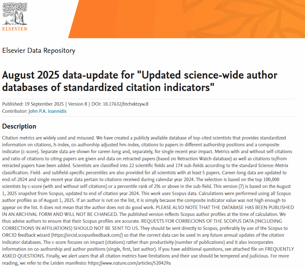 该榜单基于Scopus数据库近700万科学家数据,通过学术产出、引用次数、h因子等多维度指标,从22个一级学科及170余个细分领域中,评选出终身科学影响力与年度科学影响力前2%的学者。其结果广泛用于衡量科学家学术水平及机构科研实力,是全球学术界公认的重要标杆。