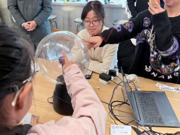 2025级邓嘉怡同学演示了“辉光放电”实验。电源开启后,高压电极激发稀薄气体,产生了梦幻般的电弧。“同学们,闪电不是只会劈大树,只要掌握电场、电离的原理,它也能变成指尖的芭蕾。”在她的引导下,孩子们踮起脚尖,争相体验“指尖闪电”的魔力,现场惊叹声此起彼伏。