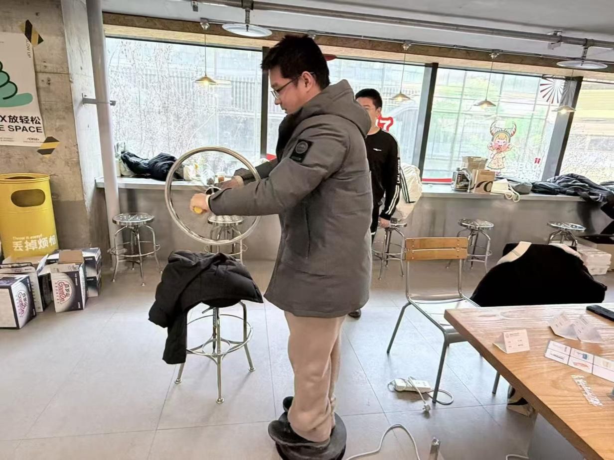 在“角动量守恒原理”展示环节,2023级程子恒同学站在可旋转座椅上,手持一个可绕轴旋转的小轮。“收手——加速!伸臂——减速!”随着他的一收一伸,身体像花样滑冰选手般实现了“无动力”变速旋转,宛如在座椅上跳起“芭蕾”。同学们由此意识到,角动量守恒不只存在于课本中,它也存在于我们伸展手臂的每一个瞬间。现场掌声与尖叫声汇成欢乐的海洋,大家纷纷感慨:生活原来处处是科学。