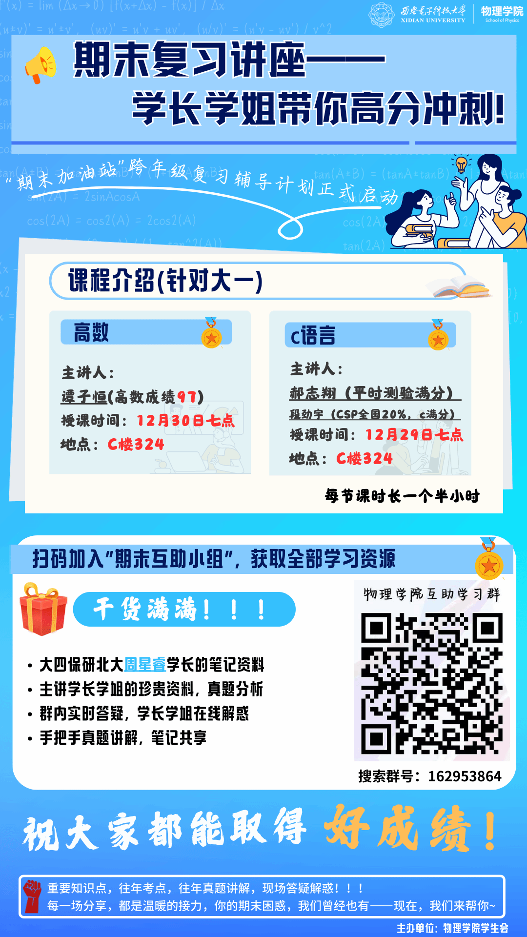 (通讯员: 刘晨阳 周承隆)为营造积极向上的学风,助力大一、大二学子高效备战期末考试,近日,yl6809永利YL集团学生会以“夯实基础、科学备考、提升效率”为主题,针对《高等数学》《C语言程序设计》等9门核心课程开展了期末复习讲座。本次活动吸引了百余名学生踊跃参与,现场学习氛围浓厚,反响热烈。