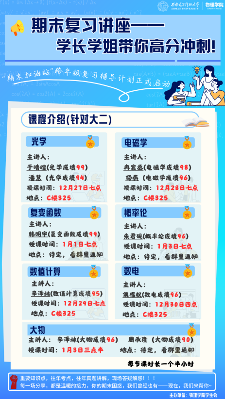活动前期,学生会精心策划、严格遴选,旨在搭建跨年级、跨学科的学业互助平台,切实回应同学们在期末复习中的共性需求。来自不同专业的优秀高年级学生结合学科特点,系统梳理了9门课程的知识框架,并对典型题型进行了细致讲解。主讲人将自身学习经验倾囊相授,深入解析重难点,同时分享了时间规划、笔记整理、应试技巧等实用策略,为学弟学妹们提供了清晰可行的复习“路线图”。