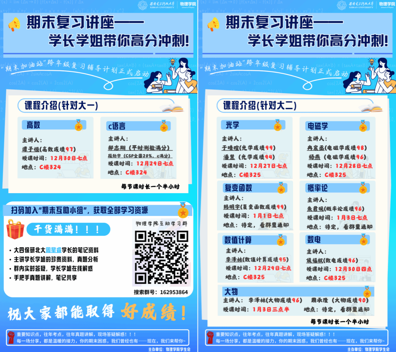 期末备考期间,为助力同学们高效复习,结合各班反馈的学科串讲需求,学院组织“党员学伴”队伍成员结合自身擅长学科,于12月22日至30日晚自习期间在信远楼I-105、I-223开展学科知识点串讲活动10余场,聚焦各科难点进行精准答疑解惑,为期末复习注入暖心力量。