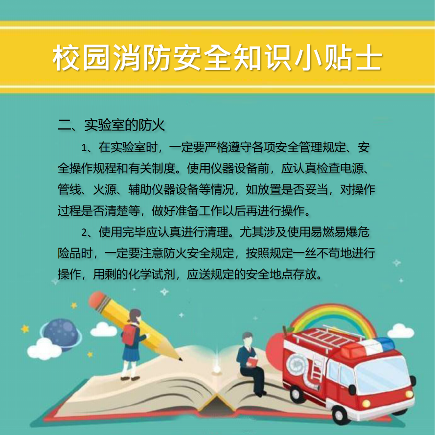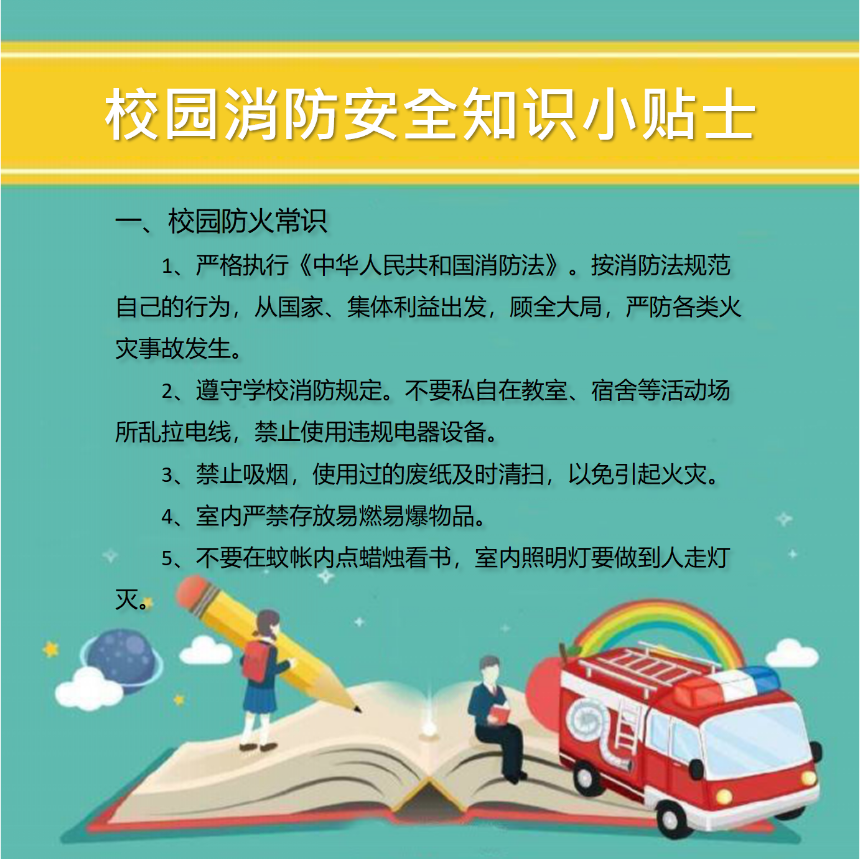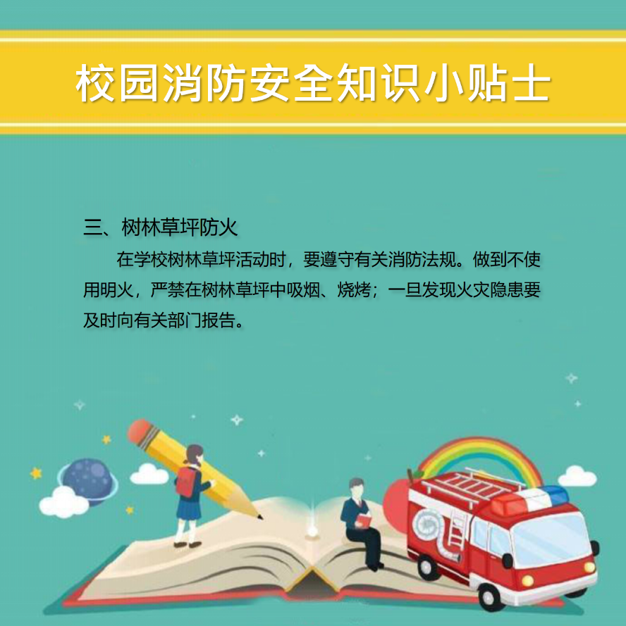 开学复课,消防安全忽视不得。学校是人员密集型场所,一旦发生火灾,后果不堪设想。学习、掌握防火基本常识,对在校师生们的个人安全是十分必要和有益的,千万不要忽视校园消防安全