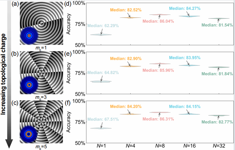 针对传统大气湍流感知方法主要依赖空间积分式一维 OAM 谱、难以有效揭示湍流空间结构特征的问题,团队提出了空间分辨二维 OAM 谱大气湍流感知新方法(如图2所示)。该方法通过在不同径向环带解析光束的 OAM 分布信息,更加全面地表征结构光与大气湍流相互作用过程中的空间特征,并进一步结合机器学习建立了面向复杂湍流环境的智能分类模型,显著提升了模型的稳定性与可靠性,如图3所示。相关成果为自由空间光通信链路监测、自适应优化、环境遥感及高精度大气诊断提供了新的技术路径。