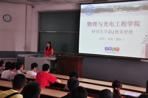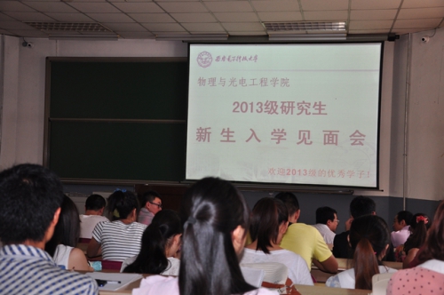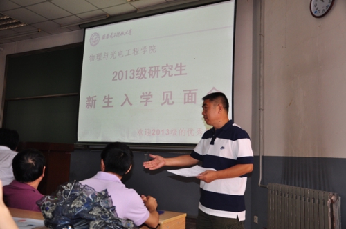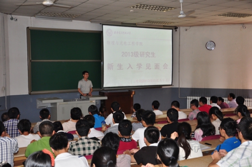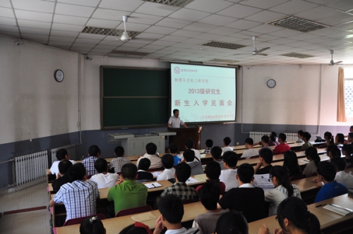 8月29日上午11点整,物理与光电工程学院在北校区教学楼101教室召开2013级研究生新生入学见面会,学院筹备领导小组组长郭立新,以及筹备领导小组成员杨光暐、李平舟、周慧鑫到场与2013级研究生新生见面,并对大家来我院继续深造学习表示热烈的欢迎。