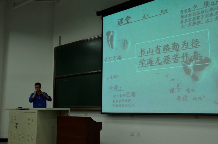作为一名来自电子科学与技术专业的大三学长,张中恺以与同学们息息相关的三个反面为讲演主线,分别是:大学,学习,生活。张中恺学长说,大学是放飞梦想的地方,在这片舞台上,我们会经历身体与精神上的磨练,从而更好地走向成熟。他将大学之路分为学习之路和生活之路两部分,并从课堂、课下与考前三方面总结了来到大学后所发生的变化。同时,他勉励大家:“书山有路勤为径,学海无涯苦作舟”。