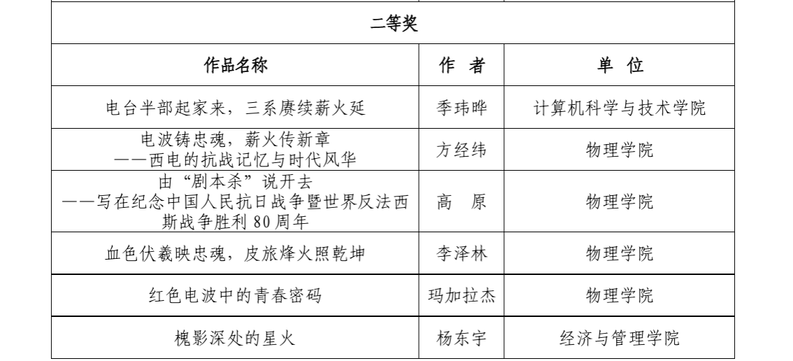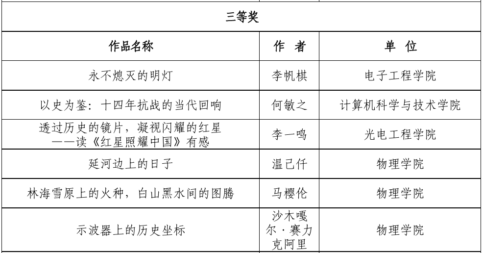 其中,柳俊杰作品《胜利的保质期:八十年后的历史拷问》荣获一等奖;李泽林《血色伏羲映忠魂,皮旅烽火照乾坤》等4篇作品获得二等奖;马樱《林海雪原上的火种,白山黑水间的图腾》等3篇作品获得三等奖,yl6809永利YL集团共8篇作品入选优秀作品,并获评“优秀组织单位”。获奖作品以物理人独特视角诠释抗战精神,将专业特色与红色基因深度融合,充分展现学院“课程思政”建设成效。