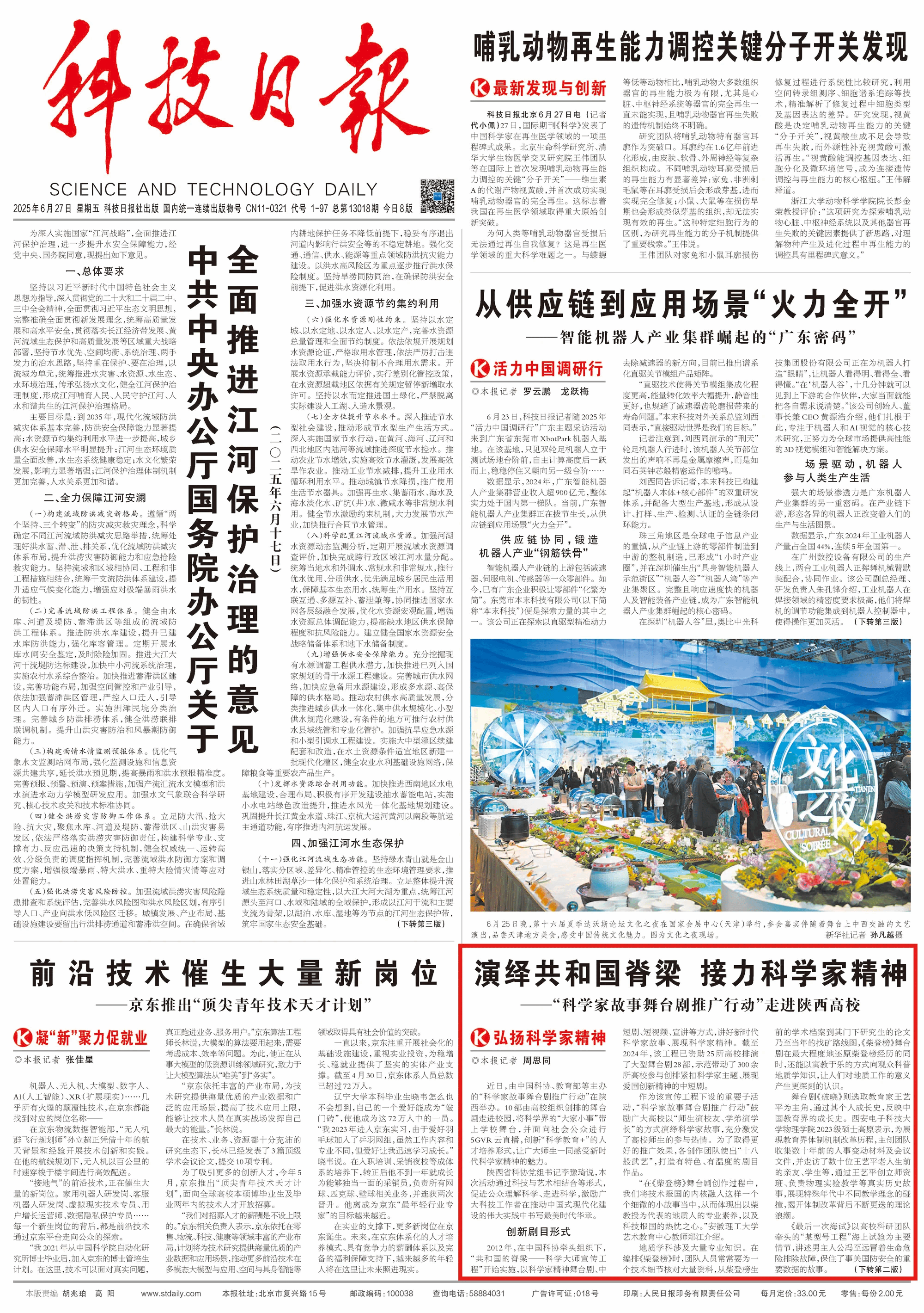 头版刊发!yl6809永利YL集团王一平舞台剧《破晓》获科技日报头版报道,学院学生接受采访