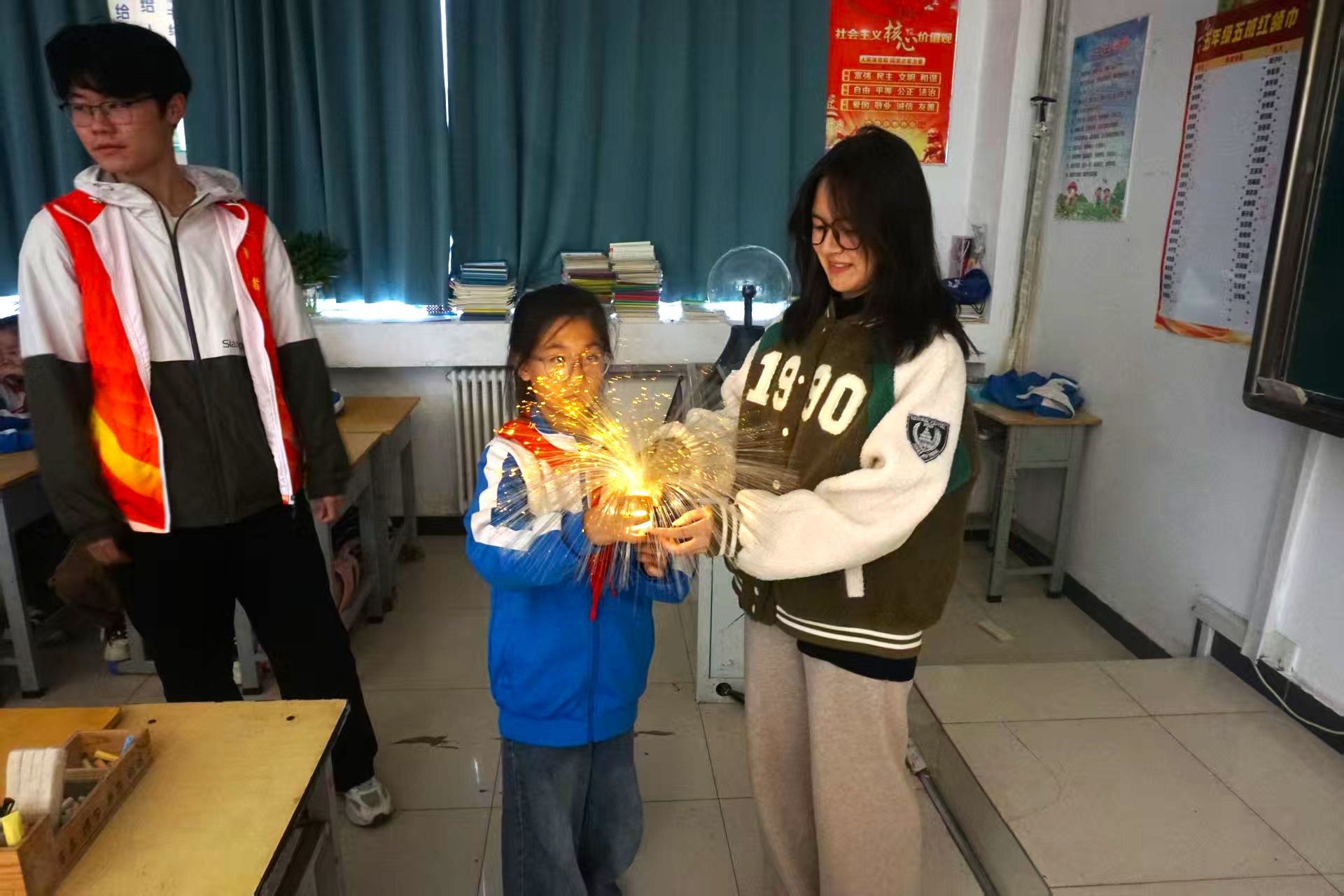 如果说牛顿摆是理性的诗篇,那么光纤花便是浪漫的画卷。随着电源接通,一束束纤细的光纤丝末端绽放出流光溢彩,宛如被施了魔法的花朵,在孩子们眼前盛开。他们小心翼翼地伸出指尖,感受光线在皮肤上流淌的奇妙。“光线就像在光纤里玩滑梯,只能沿着固定的轨道滑行哦。”志愿者用生动的比喻,将全反射的深奥原理化为童趣的语言,并引申至光纤通信等生活应用,让孩子们明白,科技并非遥不可及,而是点亮生活的温暖之光。