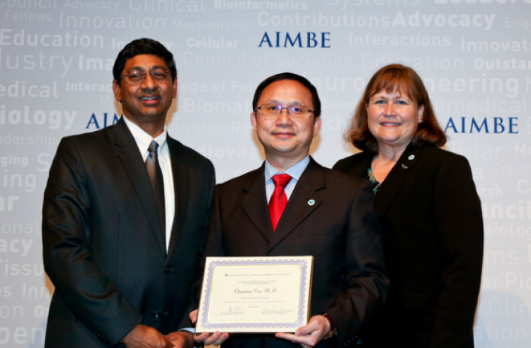 美国医学与生物工程院(AIMBE,http://www.aimbe.org)是国际医学与生物工程领域著名的非营利性学术组织,汇聚了世界生物医学工程领域的学术精英。他们代表了最具创新和特色的医学与生物工程领域的学者和工程师,其贡献对生物医学仪器、医疗器械、疾病治疗以及相关公共卫生政策的制定产生了重要的影响。AIMBE推动成立了美国国立卫生署(NIH)生物医学影像与生物工程国家研究院(NIBIB),是美国FDA专家网的创始成员(founding member),其会士(AIMBE Fellow)由世界医学与生物工程领域最杰出(Top 2%)的学者组成,每年经过国际同行推荐与严格评选产生,由现有Fellow推荐,经两轮筛选,最后一轮须经过现有的全体Fellow投票,获得74.5%以上赞成票的才能当选。