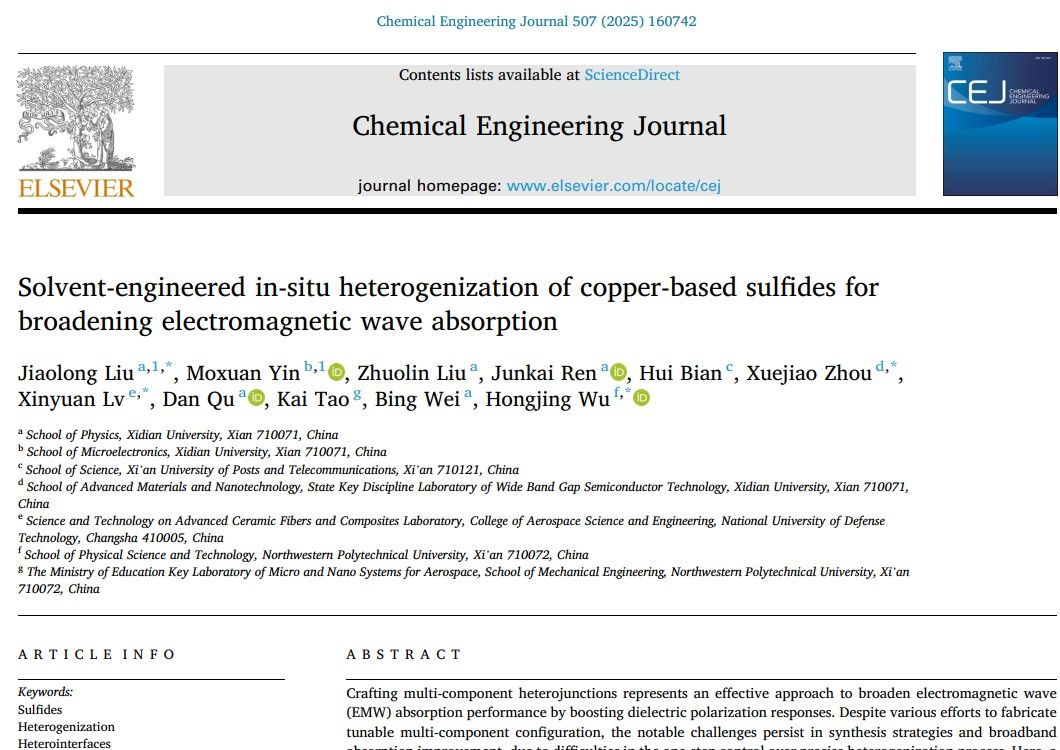 (通讯员:姚娇)近日,yl6809永利YL集团青年教师刘骄龙在电磁波吸收领域取得重要进展,在材料领域国际顶级期刊《Chemical Engineering Journal》(中科院I区TOP期刊,IF=13.2)和《Advanced Powder Materials》(中科院I区TOP期刊,IF=24.9)先后发表两篇最新研究成果“Solvent-engineered in-situ heterogenization of copper-based sulfides for broadening electromagnetic wave absorption”和“Lattice expansion/contraction ...